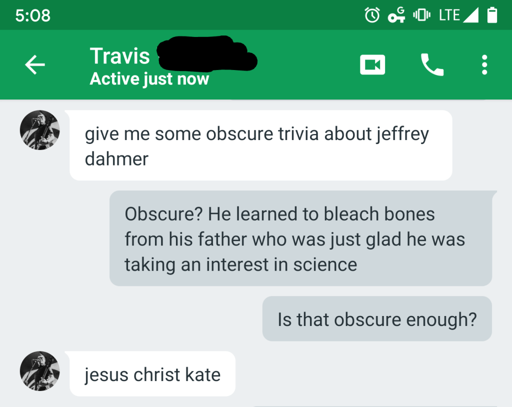 (Dee treated me like I was crazy for thinking her friend had tried to kill me, even when I told her he’d bragged about doing it before. When I confronted him about it a few years later, right in front of Dee, he said “I don’t want to talk about that.” Apparently that didn’t make much of an impression on her, either.)