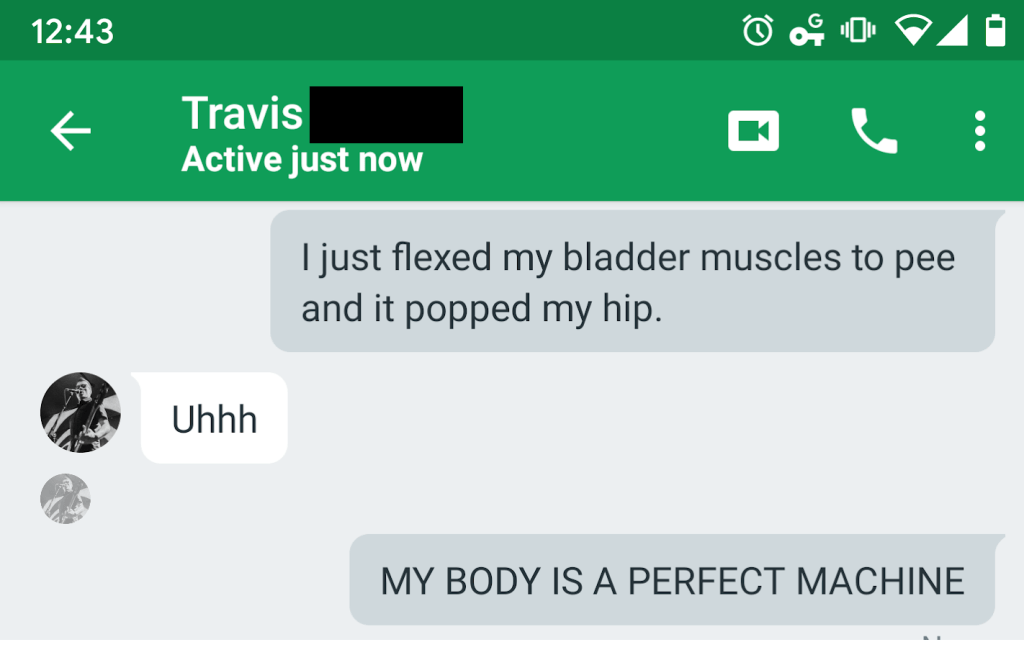 I’m used to being sick, is my point. Except, for almost a year, I wasn’t really sick. I wasn’t depressed most of the time. I wasn’t in a lot of pain. And this health crisis has put me back in the position of being feeble, of needing help, of being a fucking invalid.